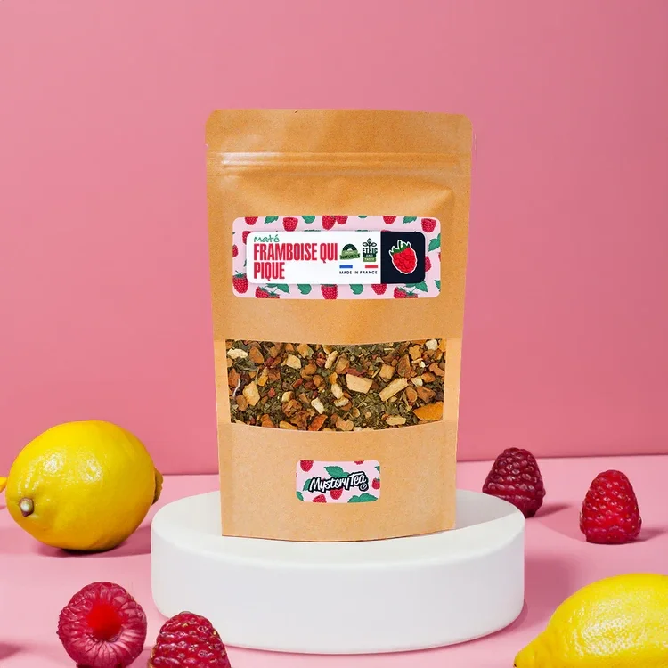 Maté, morceaux de pomme, cubes de pomme, écorce d'orange, arôme naturel, écorce de citron lyophilisée, morceaux de framboise lyophilisés.
