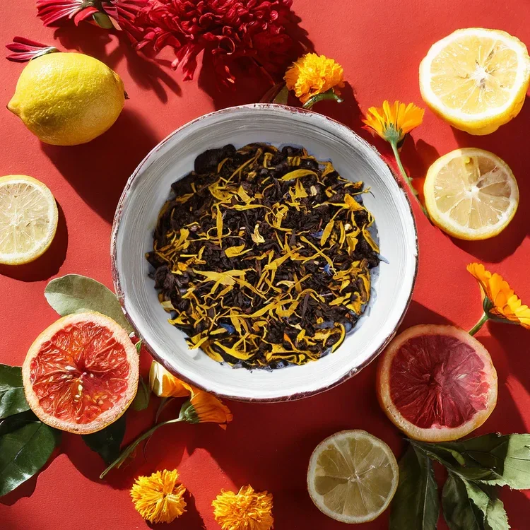 La bergamote est une variété d'orange amère, qui a un goût unique et prononcé. Elle apporte une note d'acidité et d'amertume au thé. Le pamplemousse est un agrume à la saveur douce et acidulée. Il apporte une touche de fraîcheur et de vivacité au thé. Le citron est un agrume à la saveur acidulée et aromatique. Il apporte une note de zeste et de fraîcheur au thé.