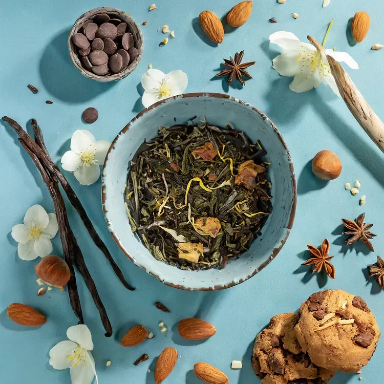 Lors de l'infusion, le thé vert sencha est libéré en premier. C'est ce qui donne au thé son goût de base. Les arômes d'amande et de vanille sont ensuite libérés, pour apporter cette touche gourmande.