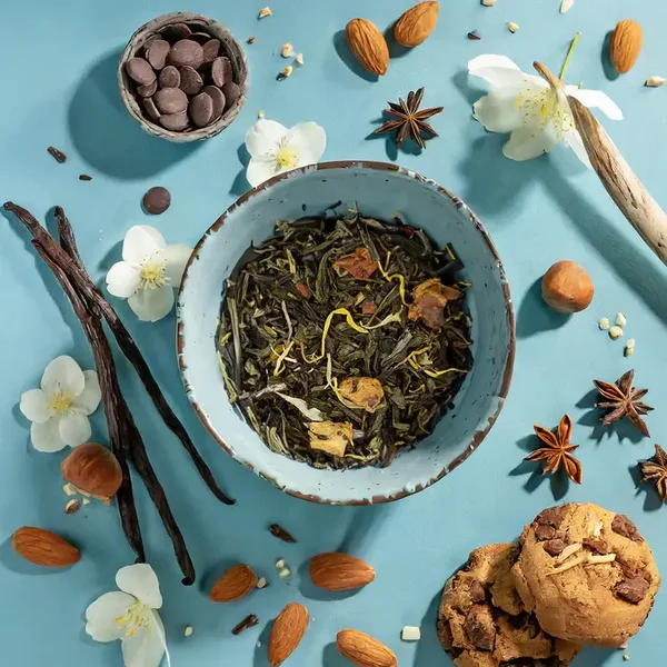 Les arômes d'amande et de vanille sont subtils et harmonieux. Ils ne dominent pas le goût du thé vert, mais ils le complètent parfaitement. Le thé est doux et pas trop sucré, ce qui le rend accessible aux personnes qui débutent dans les thés gourmands.